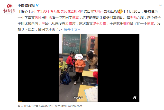 近日,安徽臨泉一小學語文老師用擁抱給一位男同學驚喜,這樣的舉動讓很多網友感動。