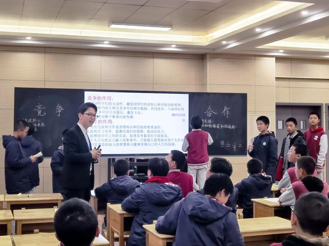 七六班班主任常雪晴老師和七四班班主任李金龍老師,實現了班會課的同題異構,都已《競爭與合作》為主題,共同探討了競爭與合作的關系。
